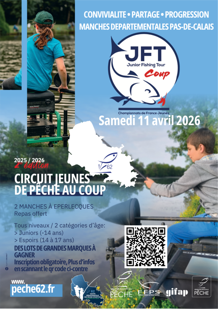 Le JFT Coup s’adresse aux jeunes passionnés de pêche au coup, discipline exigeante qui demande précision et patience. Encadrés par des éducateurs et des bénévoles expérimentés, les jeunes compétiteurs évoluent dans un environnement sécurisé, pédagogique et stimulant. L’objectif est clair : apprendre tout en prenant du plaisir. Ainsi, le département du Pas-de-Calais organisera deux manches dans le cadre du circuit pêche au coup le samedi 11 avril 2026 :